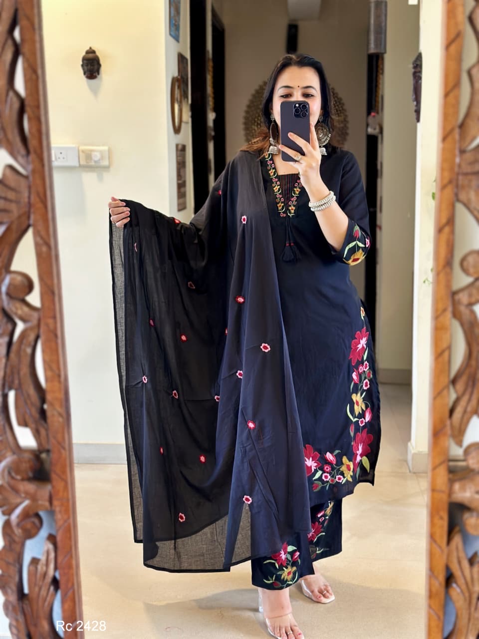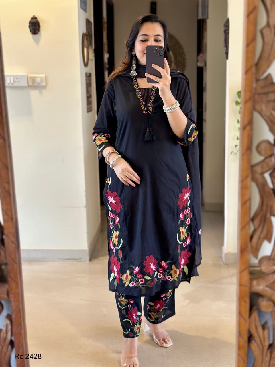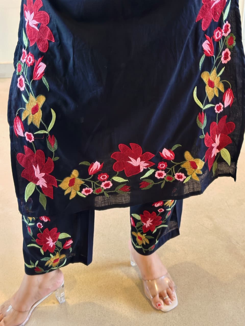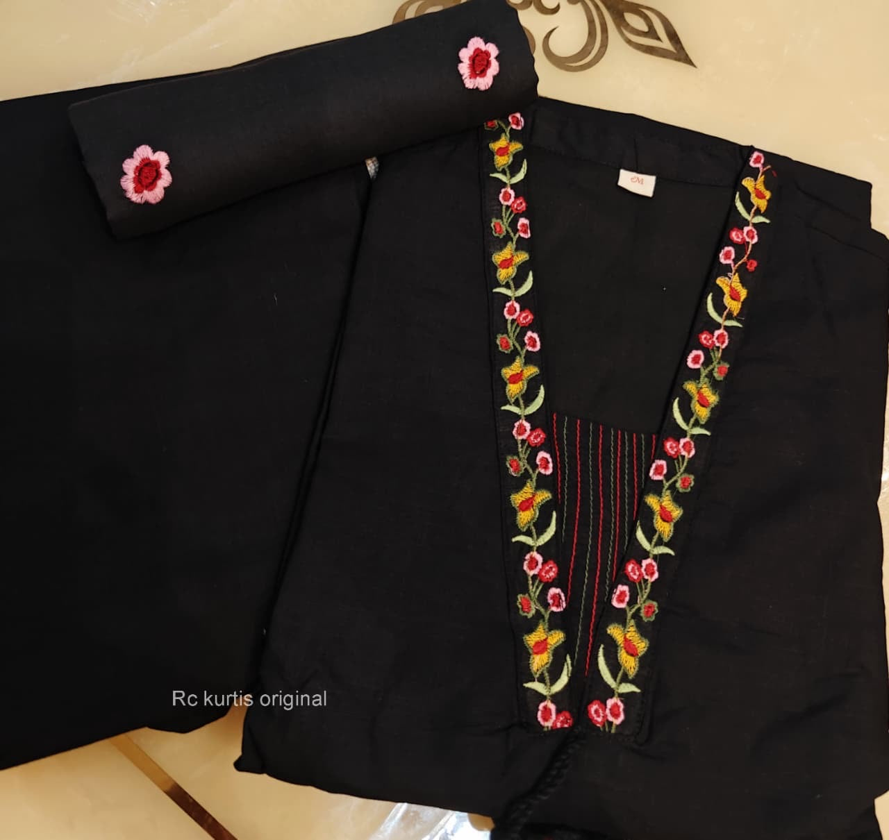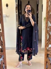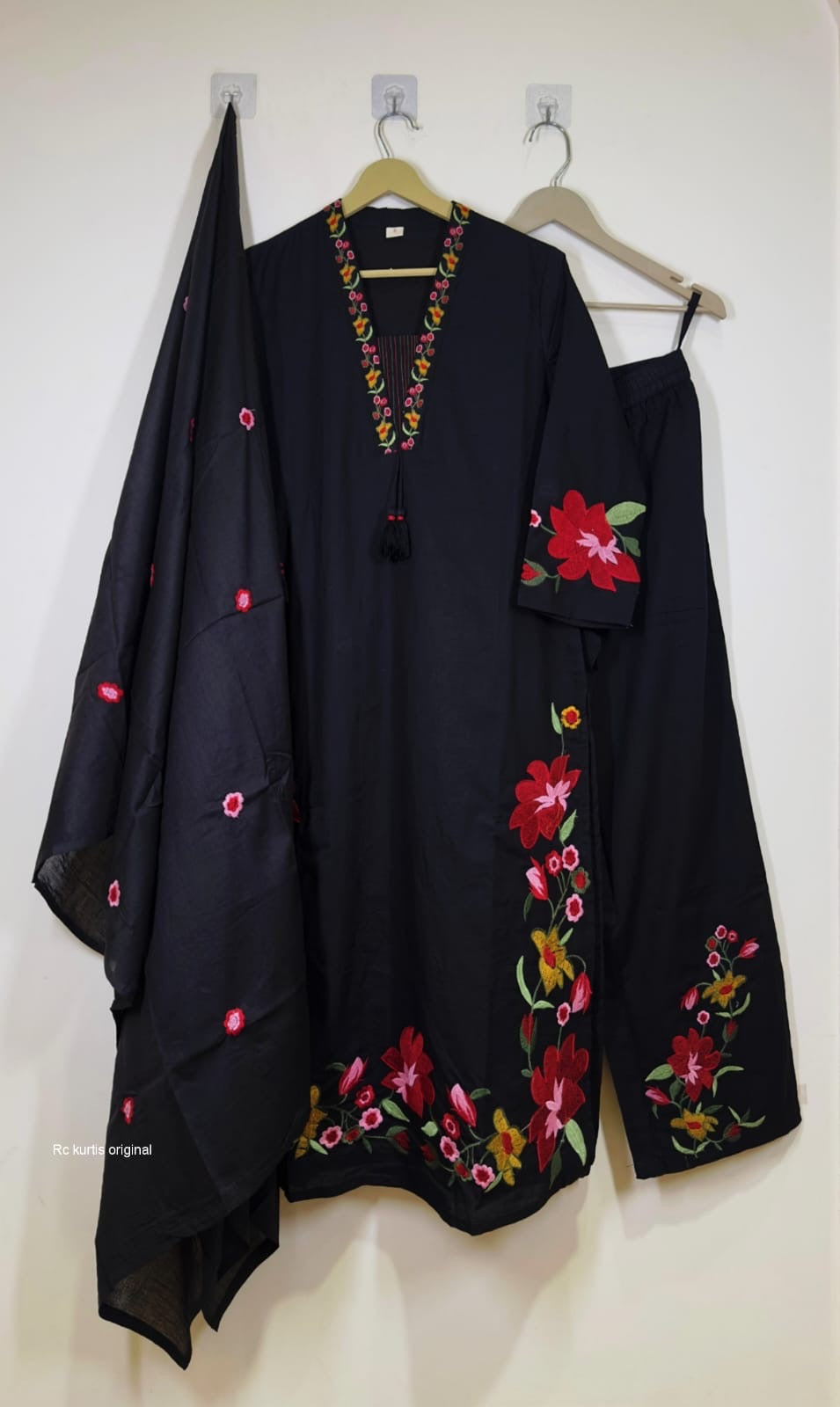 Beautiful cotton heavy work embroidery & kantha work suit with tassels 🦋🦋🦋🦋🦋🦋🦋 cotton straight kurta Cotton straight pant with embroidery 🪡 Cotton mul duppata with embroidery Work - embroidery & kantha work 🪡 *Size- 38,40,44,46* *Material* - cotton Kurti length - 46 in inchesPant -38 inDuppata - 2.4 meter full length Colour -Black dispatch ready