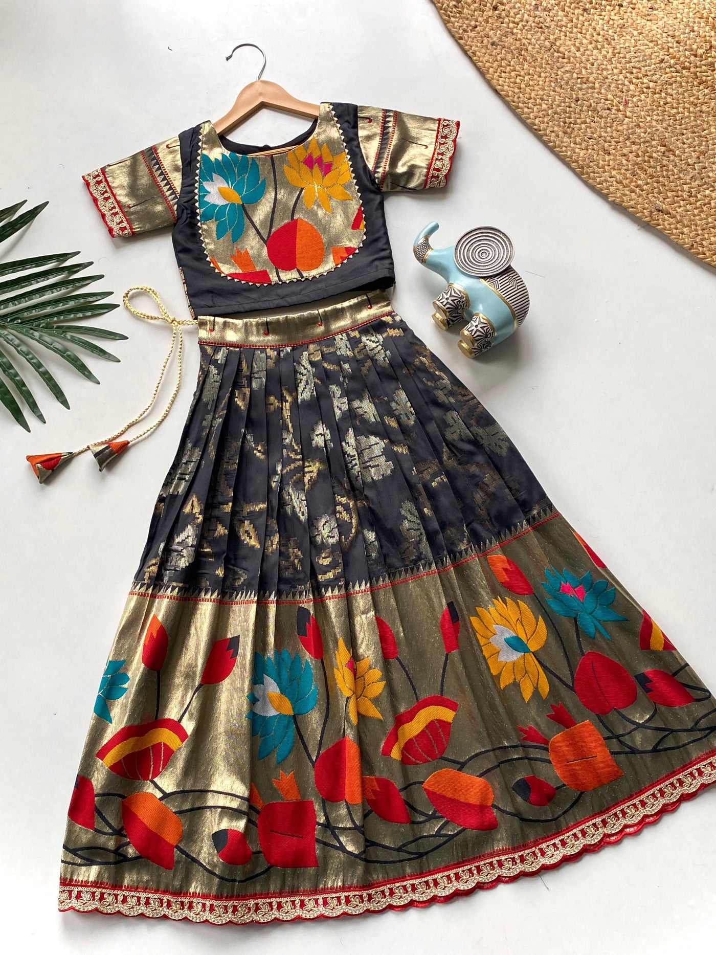 Festive-ready skirt and top set for girls, featuring elegant weaving, panel detailing, embroidered lace highlights, and a beautifully crafted yoke — perfect for special occasions.   Available in seven beautiful colors.   Fabric :-silk blend  Lining :- crape      Available size :- 1month to 16 year