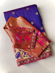 Pure paithani silk saree with beautiful weaving border with all over buttis and rich pallu Scalloped border attached❤️ Teamed with beautiful stich paithani blouse( as shown in pic)