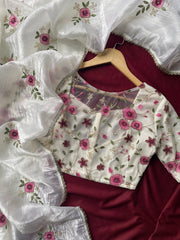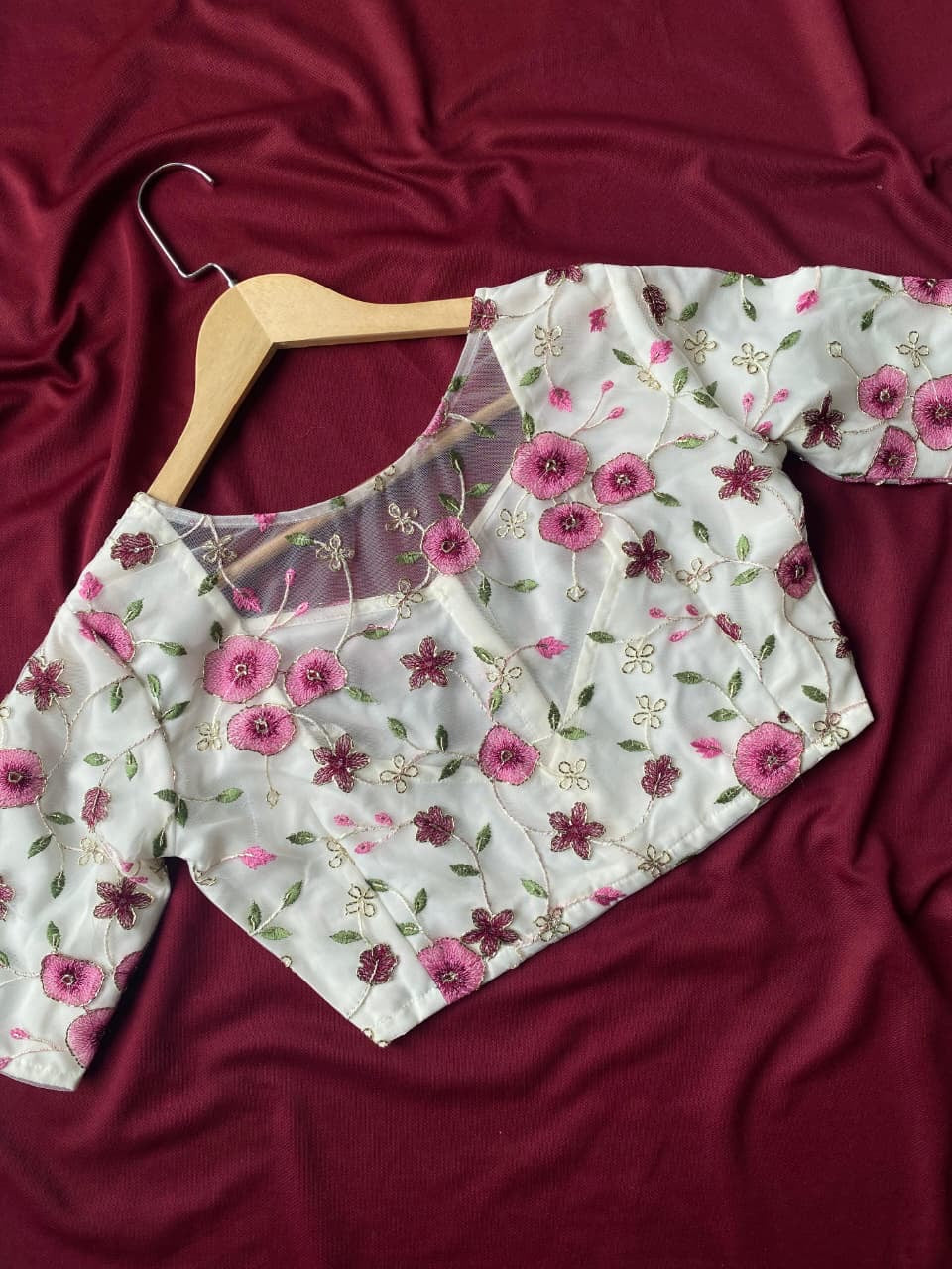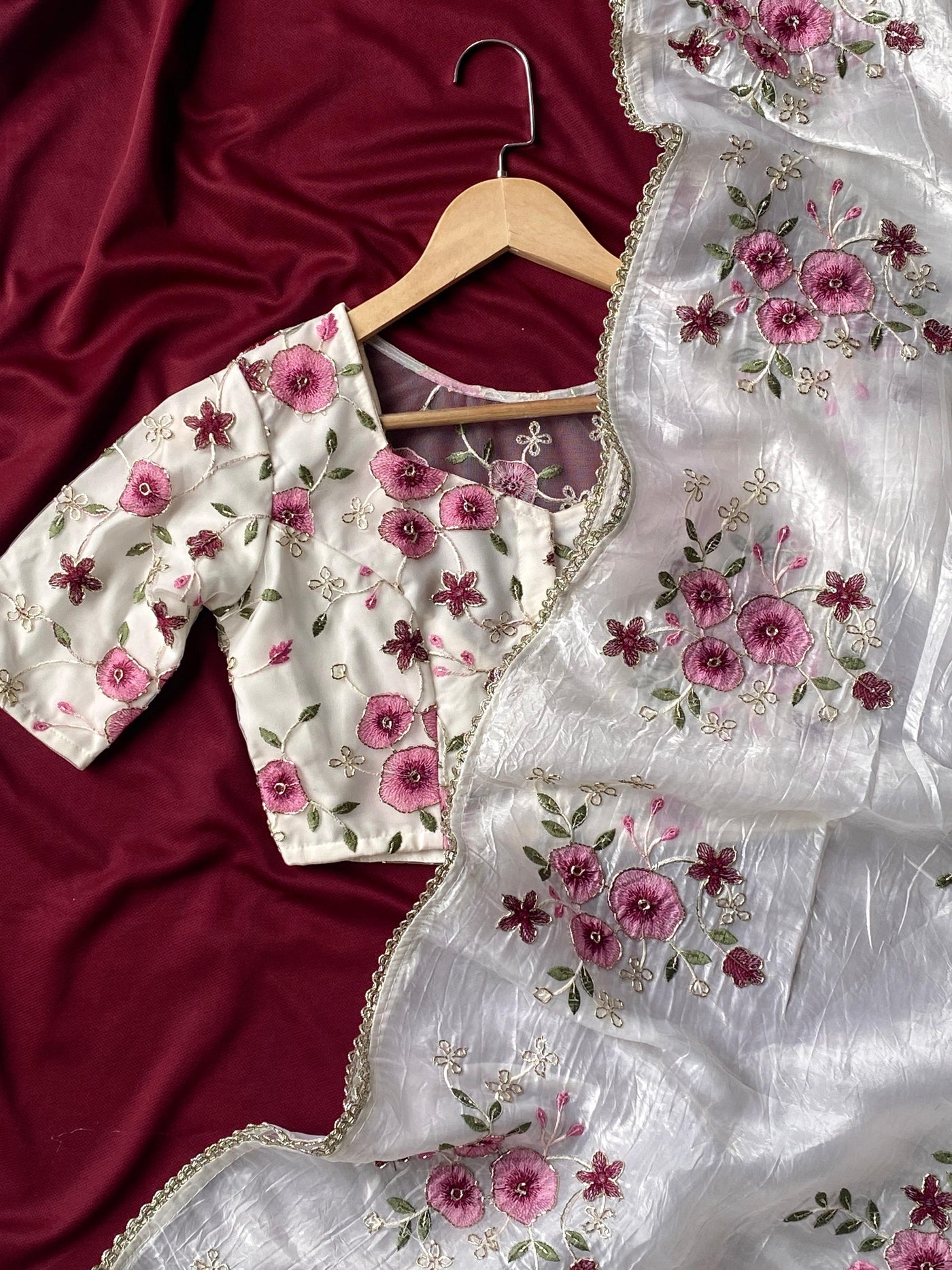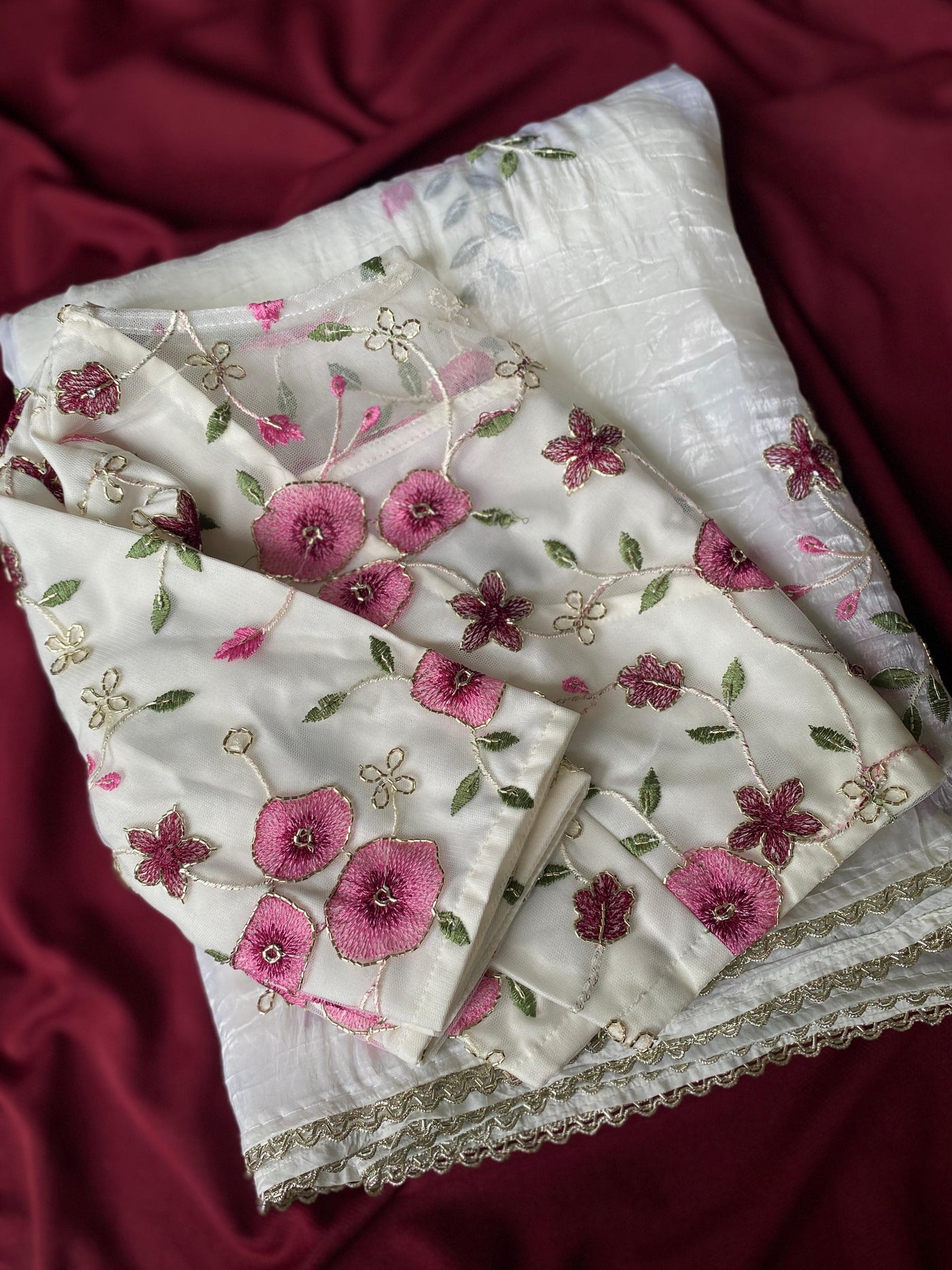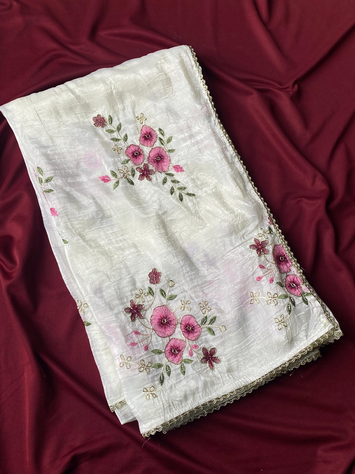 Pure crushed saree with beautiful flower embroidery done on sarees with hand work done all over the saree