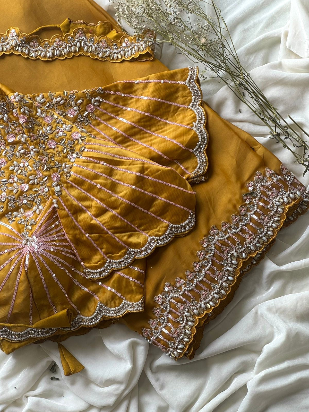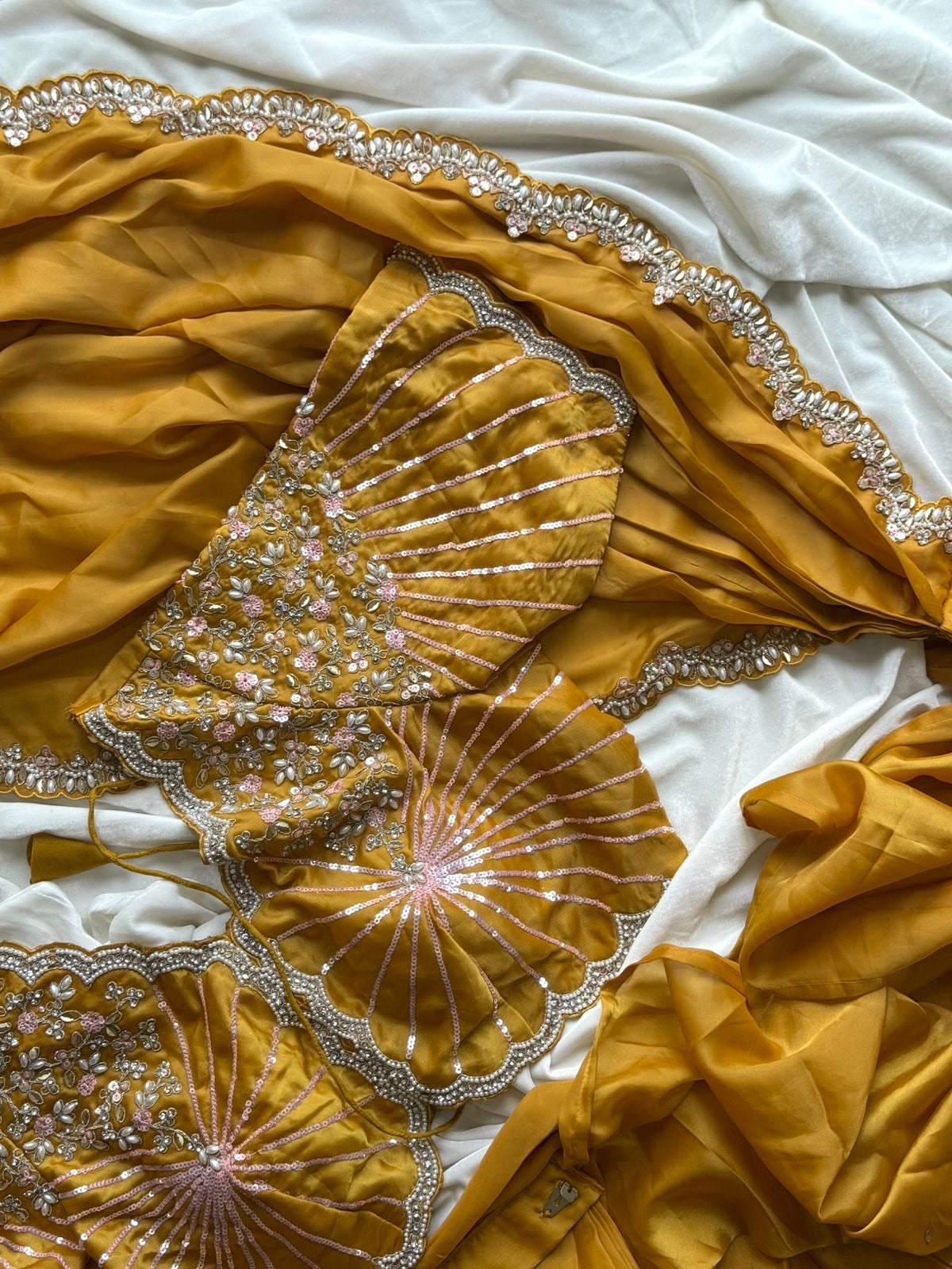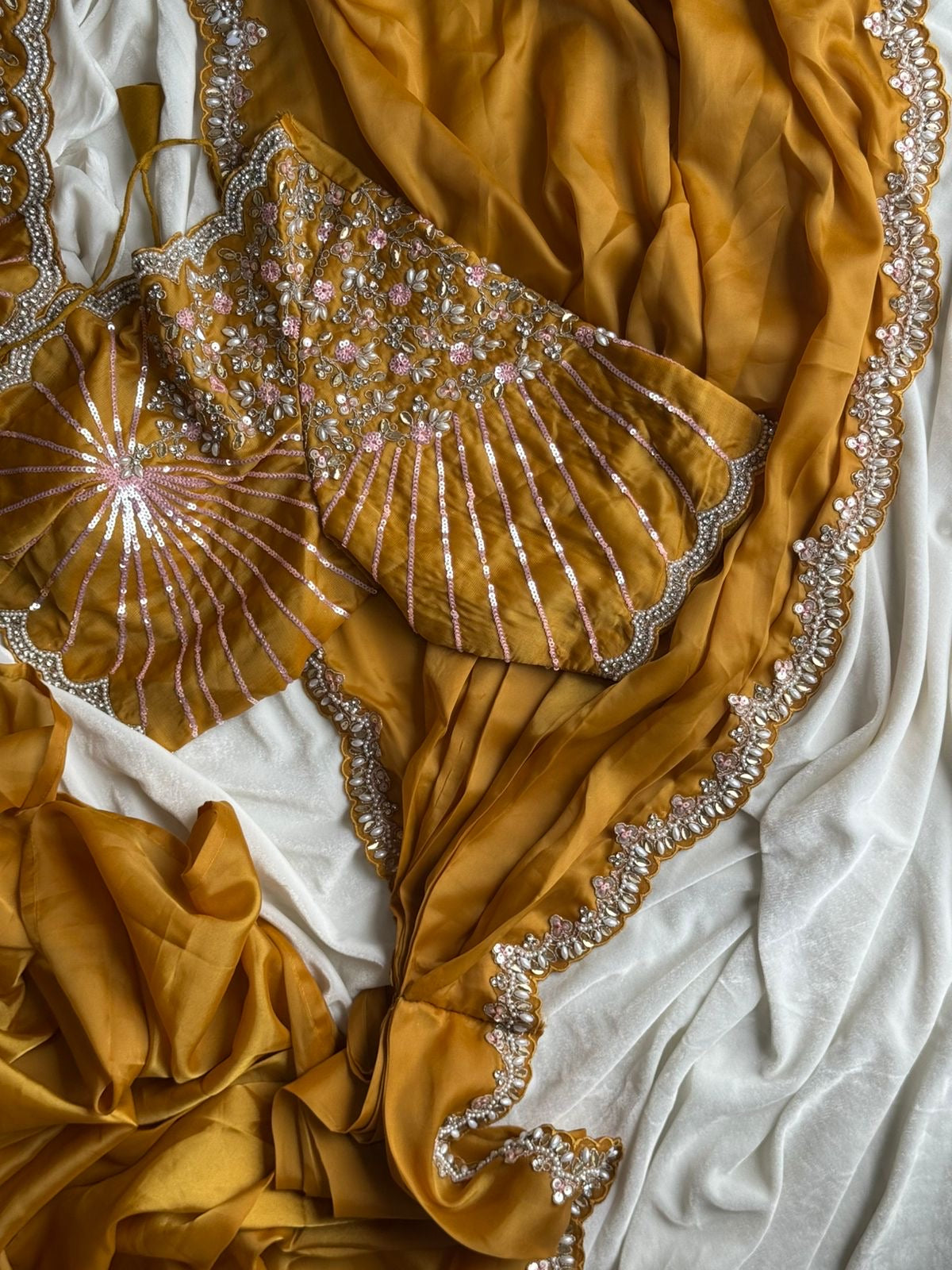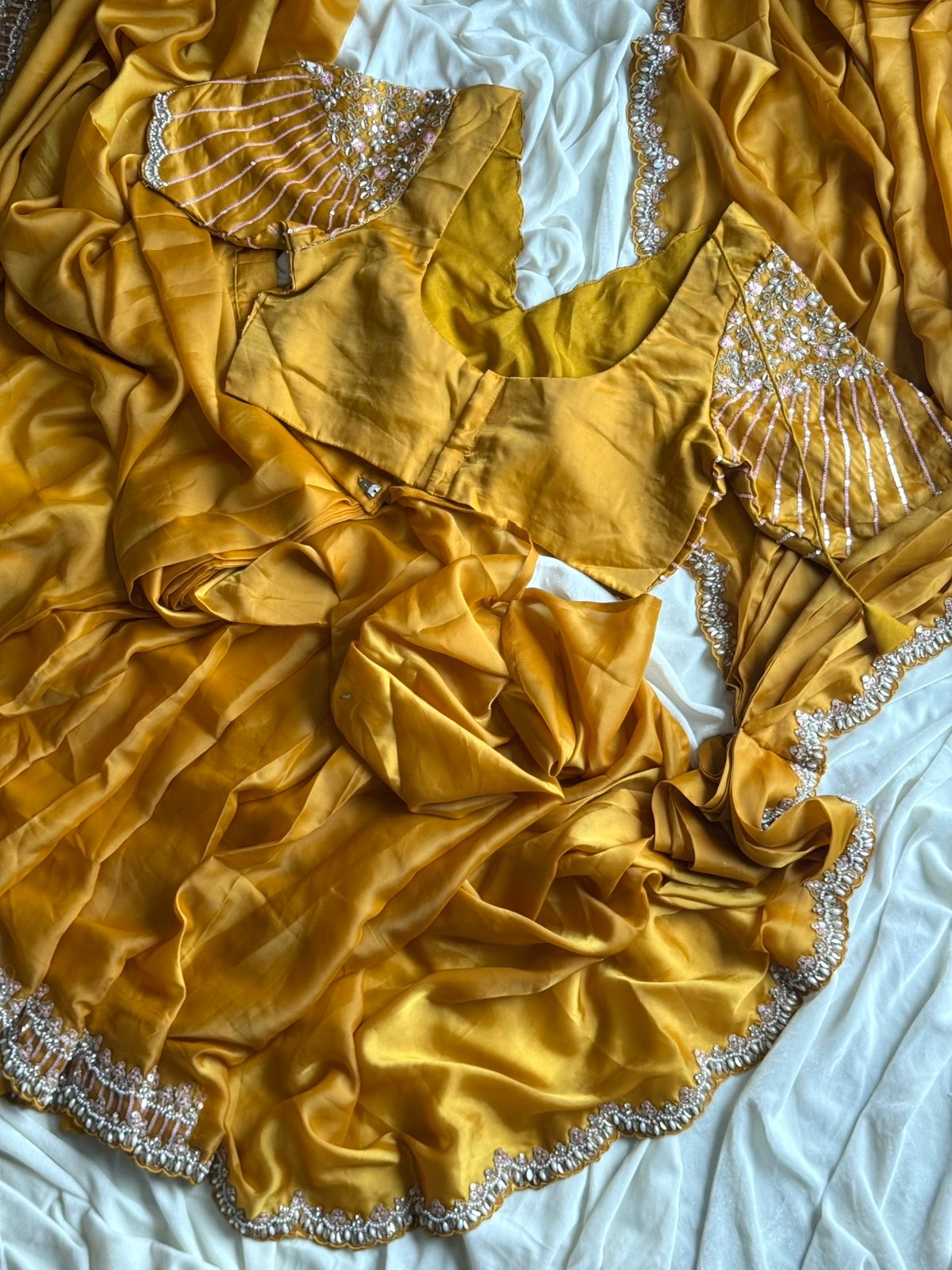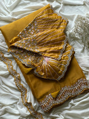 Excuslive & premium arrival. ❤️ *trendingsareee* Lovers’s #Haldirasham1minsaree *1 min saree* ready to wear a saree designed for effortless and quick draping. allowing wearers to get dressed in less than a minute. These saree are often made from easy-to-drape fabric space silk with fully coding sequence& pearls work lace on either side of border Blouse :- fully stitched sequences & pearls work blouse