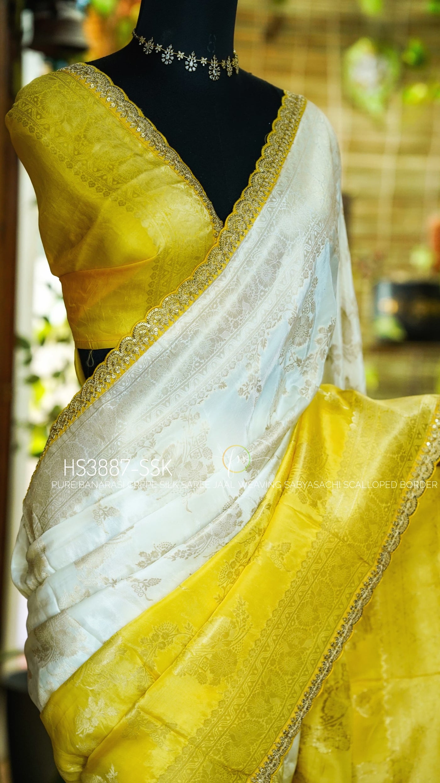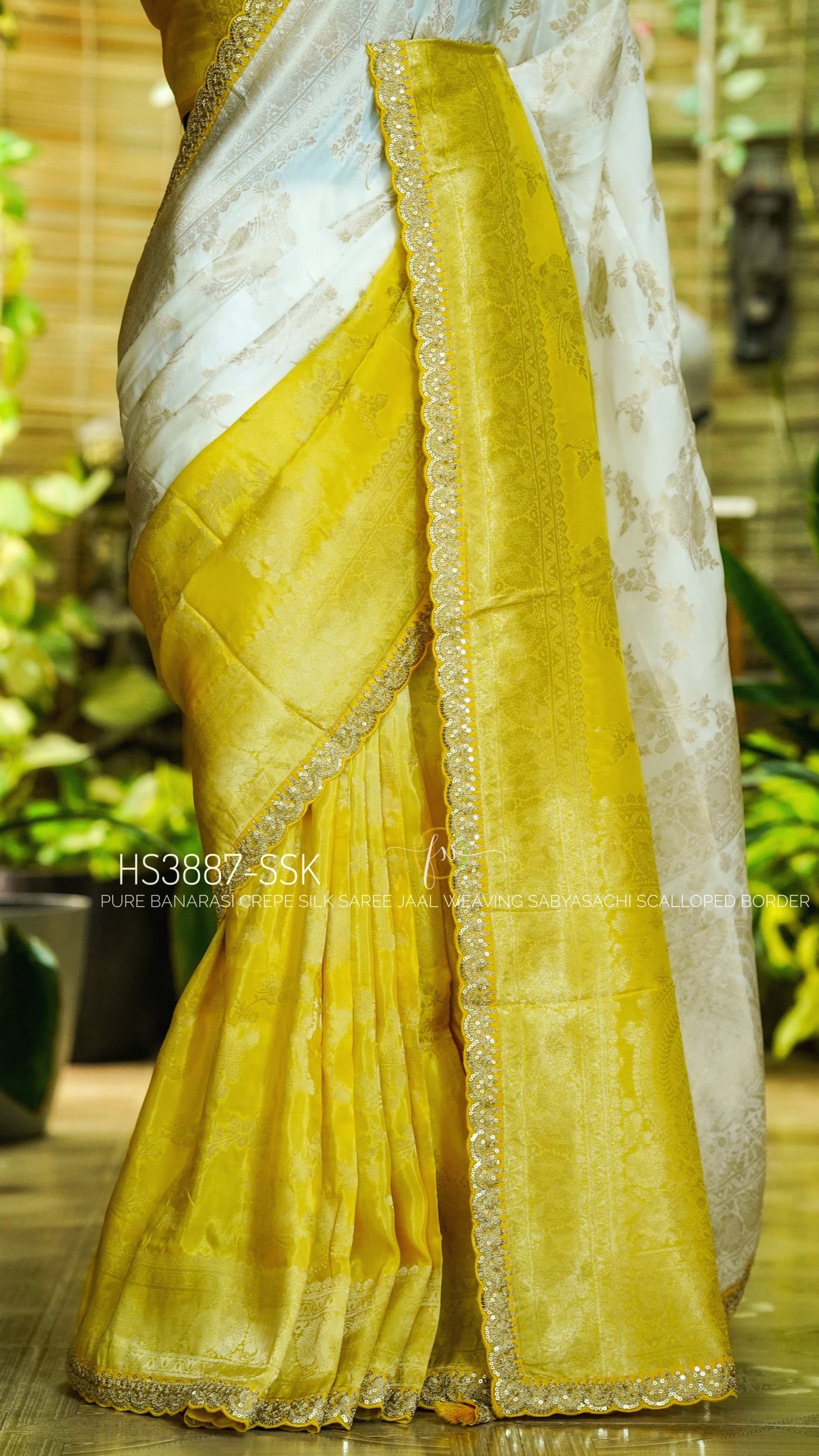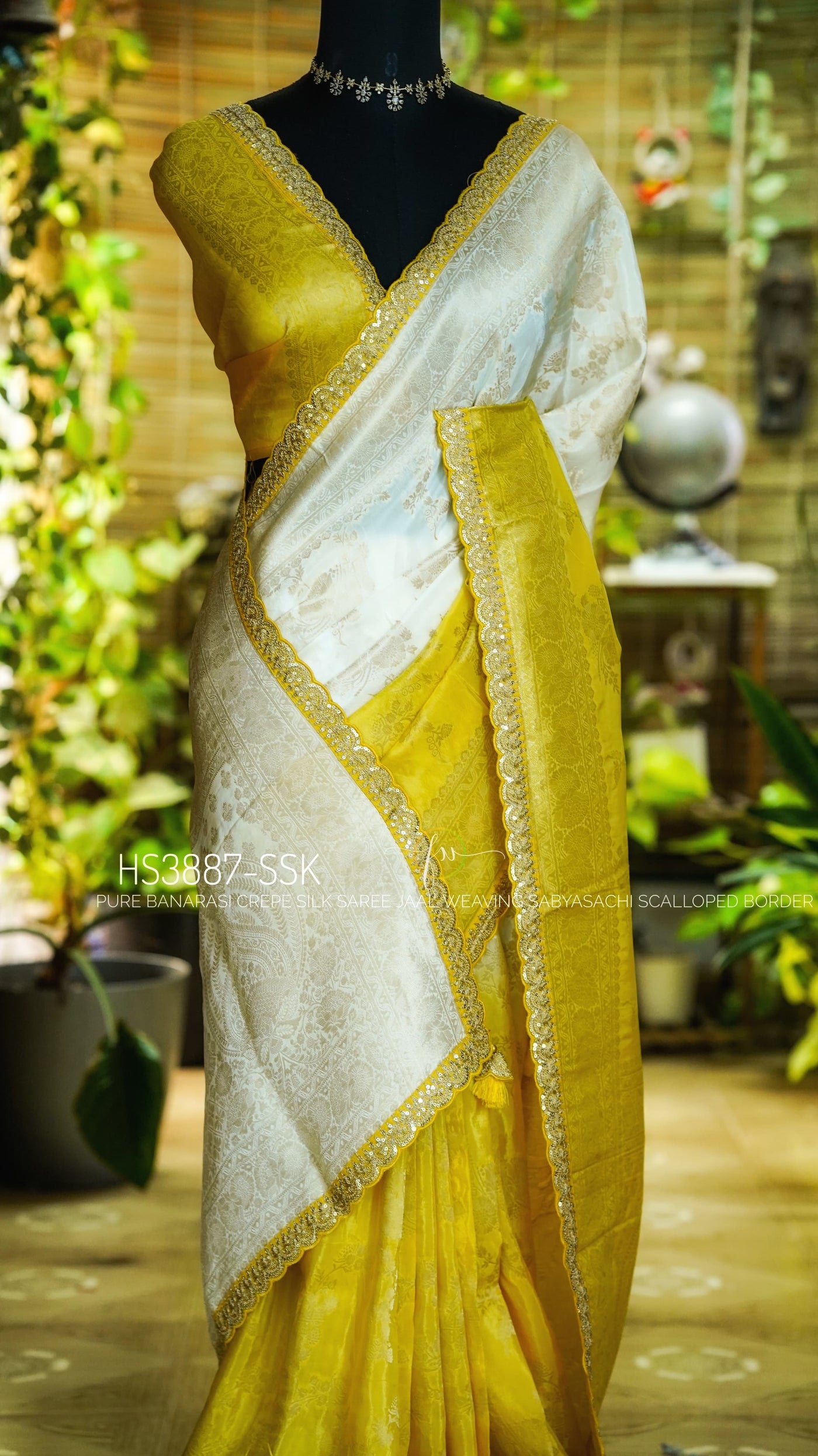 A timeless masterpiece in *pure Banarasi crepe silk*, this saree gracefully flows from *sunny yellow to pristine white*, creating an ombré effect that’s simply enchanting. Adorned with *delicate golden zari jaal weaving* and *tiny floral motifs*, it features a *scalloped Sabyasachi-style zardosi border* that adds a regal touch. The matching blouse completes the look with effortless elegance – *perfect for weddings, haldi ceremonies, or grand festive moments*.