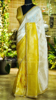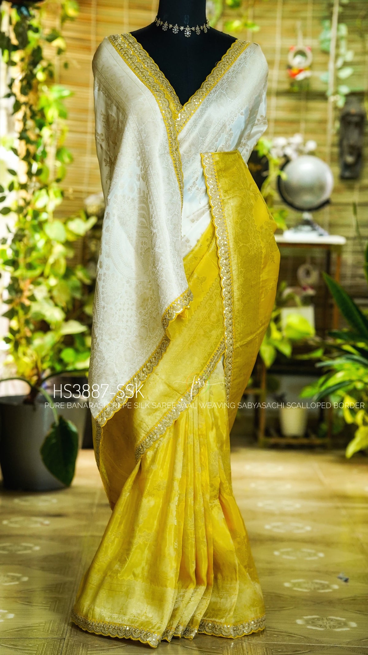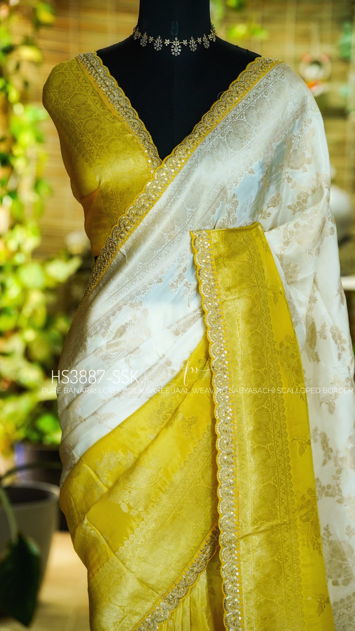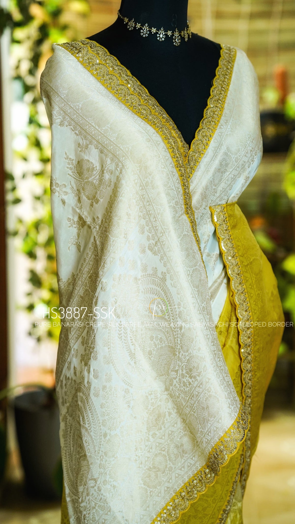 A timeless masterpiece in *pure Banarasi crepe silk*, this saree gracefully flows from *sunny yellow to pristine white*, creating an ombré effect that’s simply enchanting. Adorned with *delicate golden zari jaal weaving* and *tiny floral motifs*, it features a *scalloped Sabyasachi-style zardosi border* that adds a regal touch. The matching blouse completes the look with effortless elegance – *perfect for weddings, haldi ceremonies, or grand festive moments*.