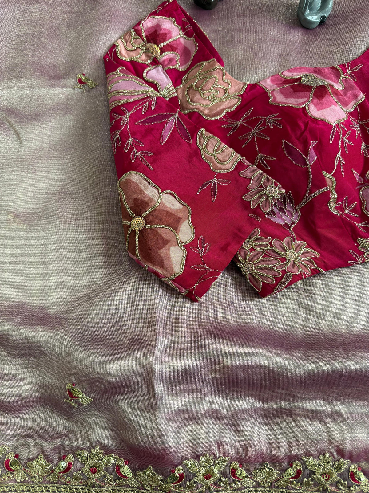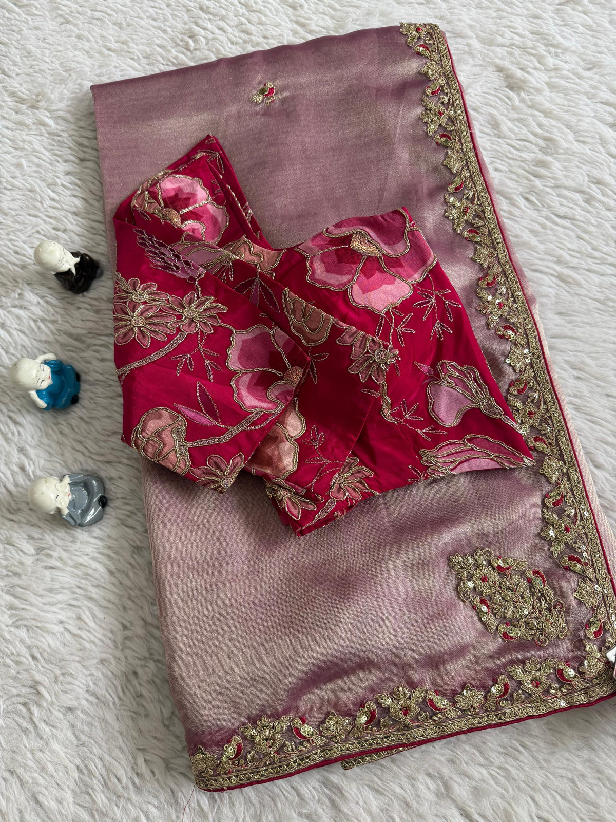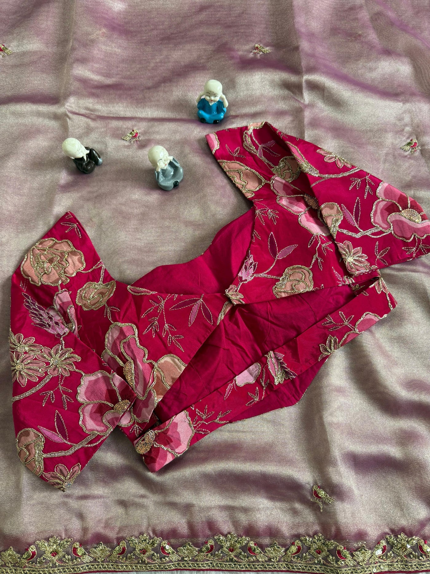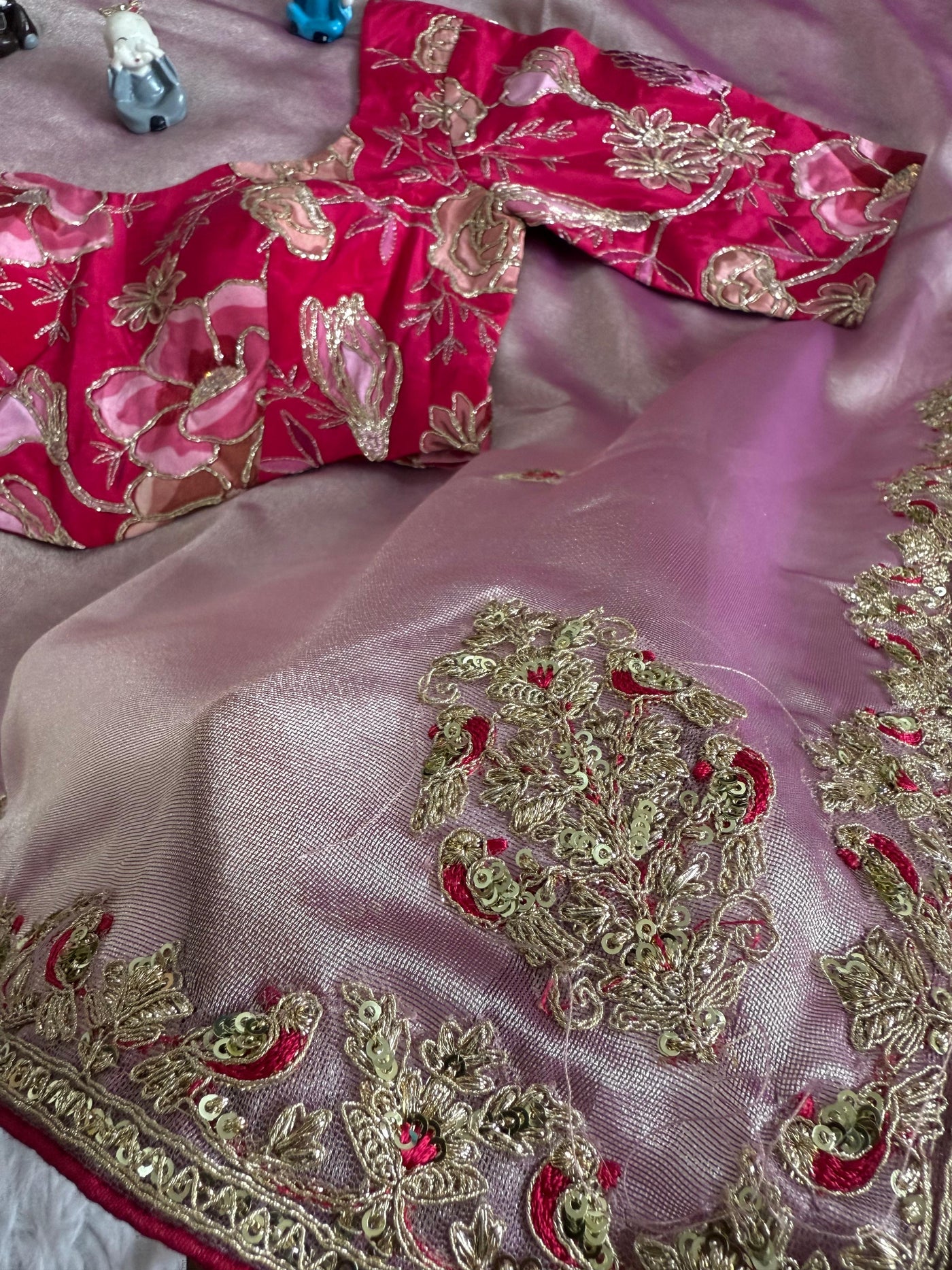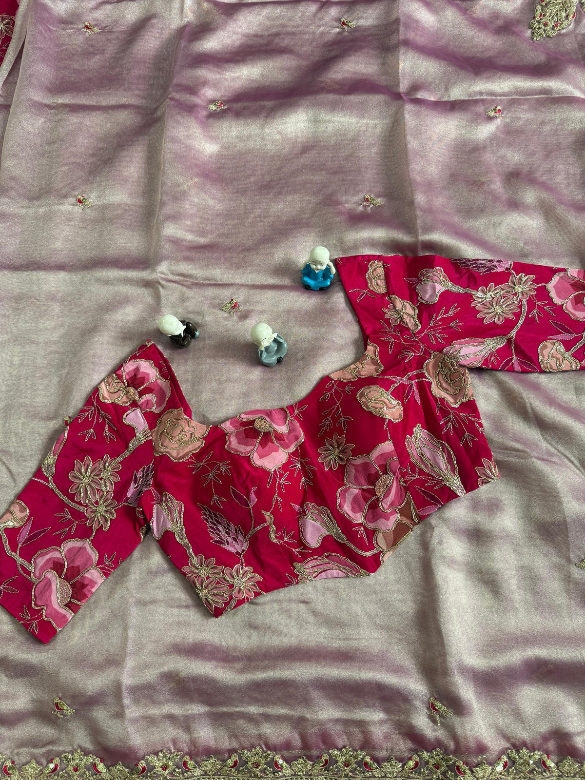 *Premium Collection* Premium tissue saree with handwork figure motifs on all over the saree Coding Embroidery & Sequece work border on either side Teamed with designer stitched blouse as shown