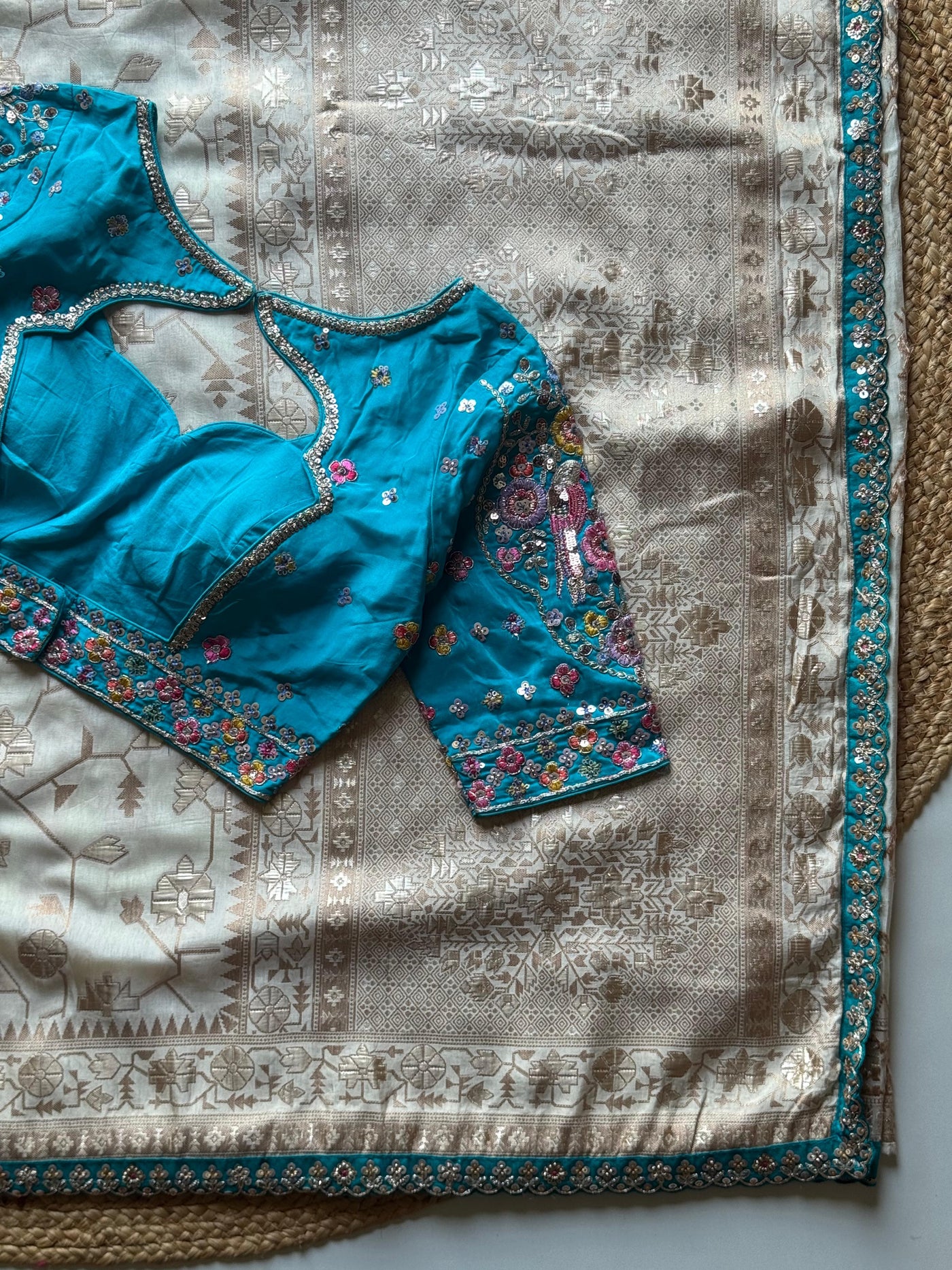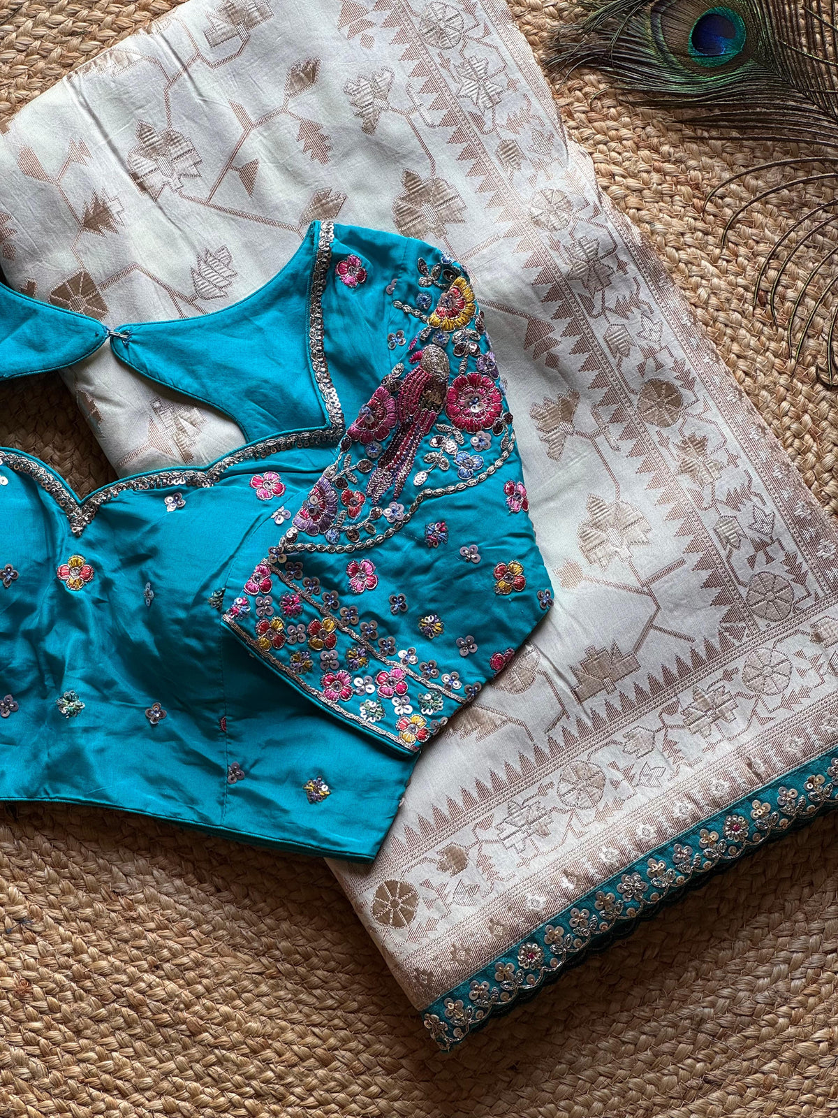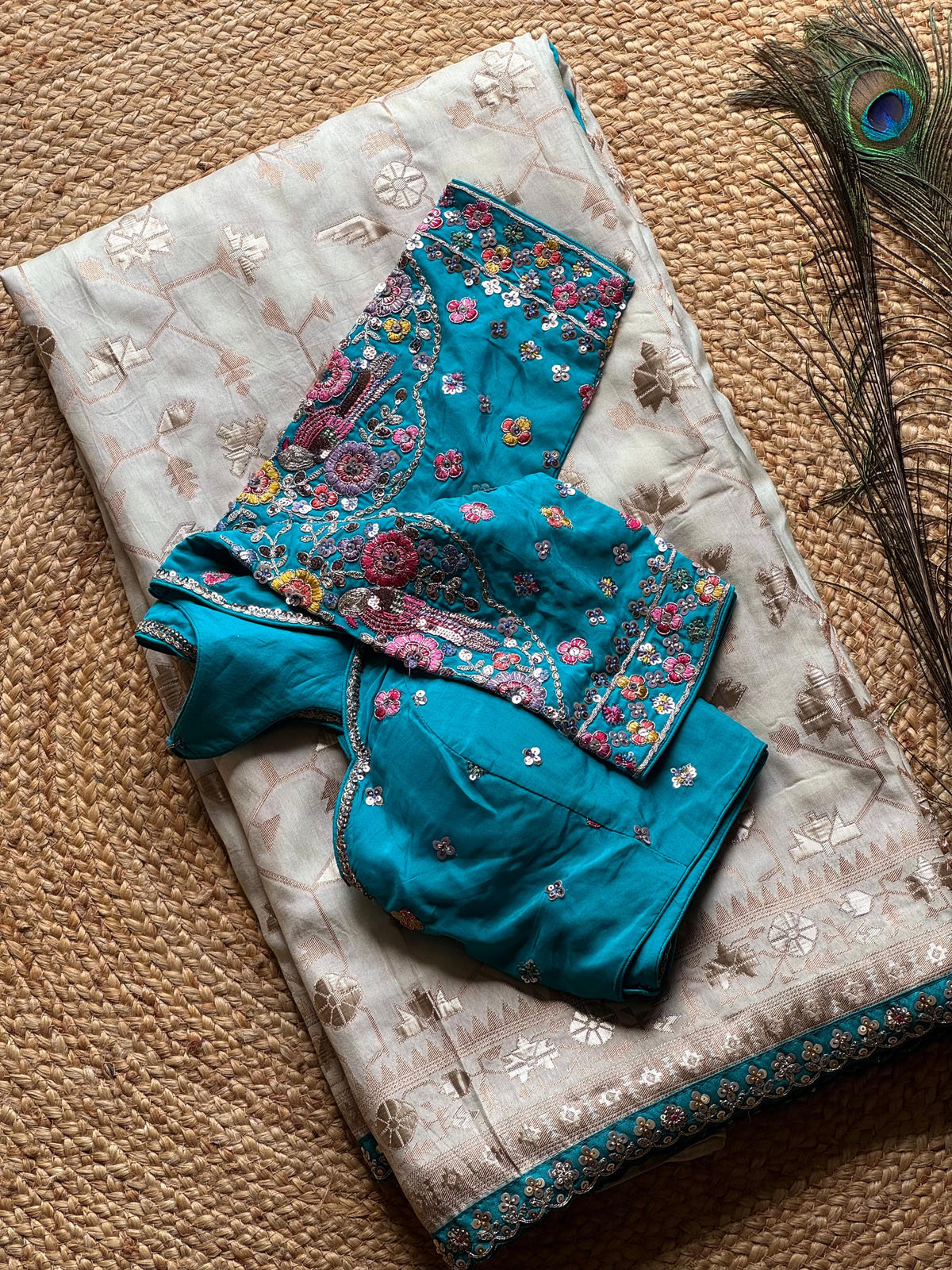 Exclusive & premium arrival ❤️ Munga silk saree with allover intricate weaving added with scalloped embroidered border and rich contrast embroidered blouse (Unstitched blouse)   *For stitched blouse 350 extra charges*
